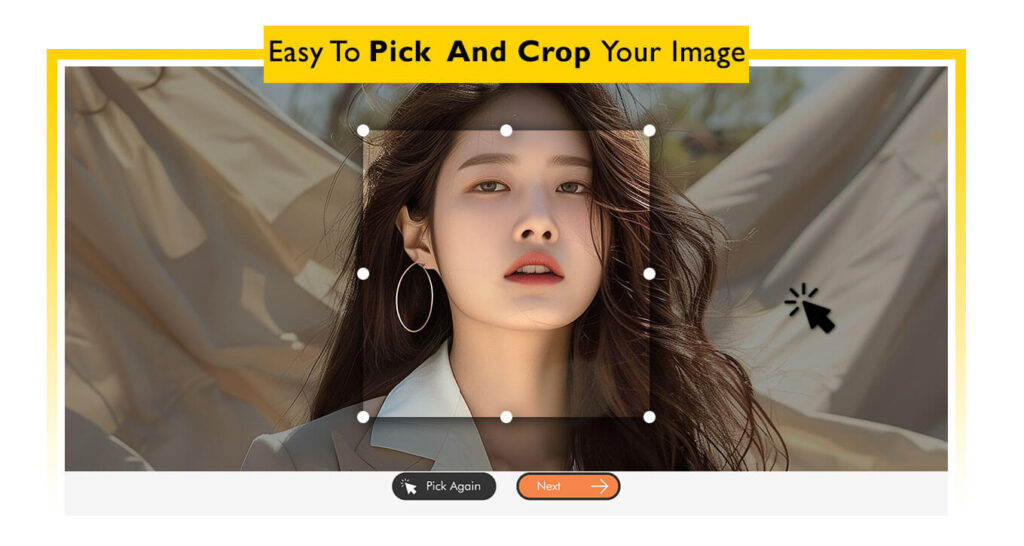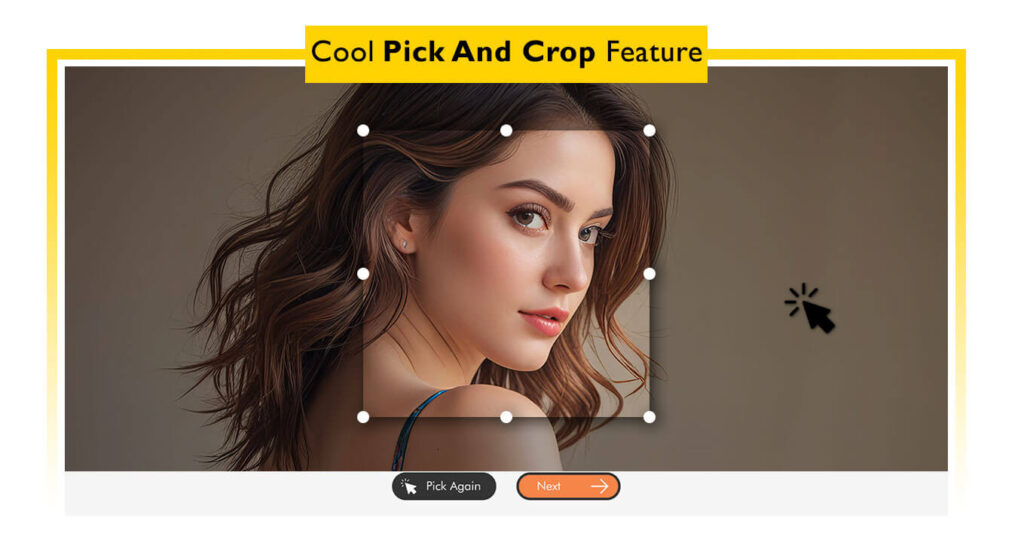- Click on the Artify icon, select a photo from your gallery, and crop it as needed. After cropping, click Next. If you want to change the photo, click Pick Again, select a new photo from your gallery, crop it, and then click Next.