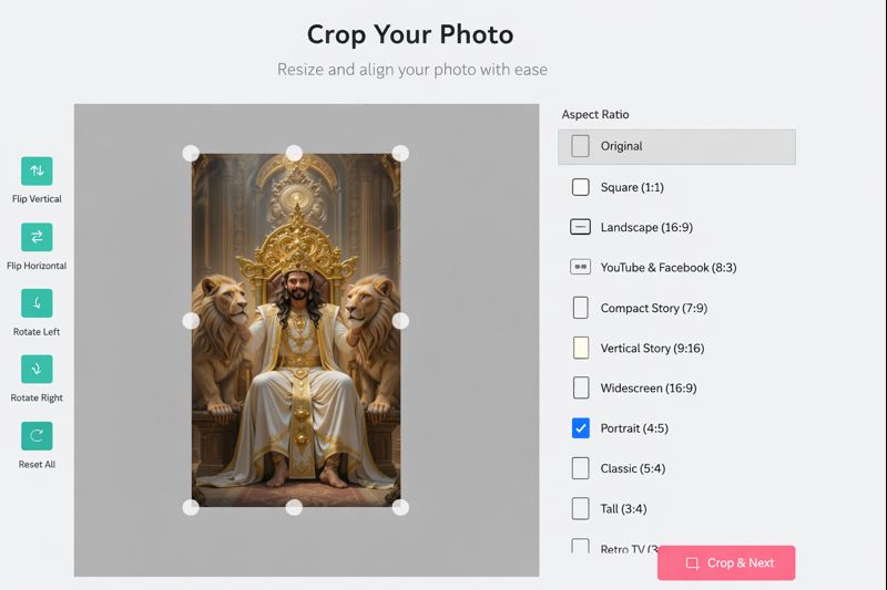 After selecting a photo, you can crop the image or choose your preferred aspect ratio using various social media presets. Remove any unwanted portions of the picture before proceeding.