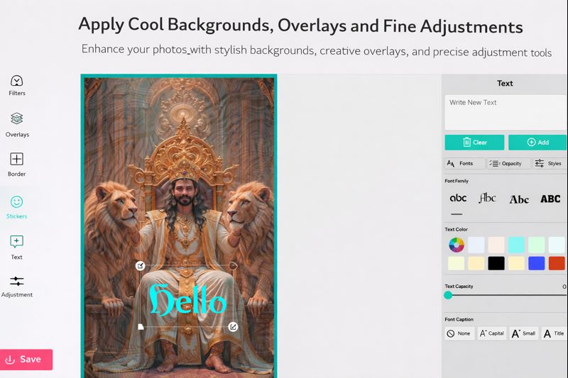 Use additional tools like Filters, Overlays, Border, Stickers, or Text to enhance your design further.