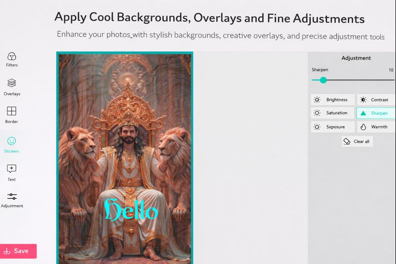 Fine-tune your image using adjustment tools such as brightness, contrast, saturation, and more for better clarity and balance.